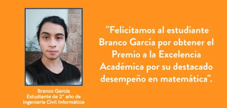 Branco García, estudiante de segundo año de Ingeniería Civil Informática obtuvo este premio por su rendimiento en matemática, tras alcanzar un promedio de 6,5 en la asignatura. Según comenta, ingresó a ingeniería por su gusto por los cálculos y por la intención de solucionar diversos problemas a partir de las herramientas que otorga esta disciplina. Incluso antes de ingresar a la carrera, ya tenía conocimiento sobre programación y diseño de algoritmos. Eso lo motivó a elegir la especialidad de Ingeniería Informática, que espera poder transformar a futuro en un aporte para la sociedad y en una mejor calidad de vida para su familia.