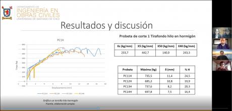 Los estudiantes abordaron los resultados obtenidos del estudio experimental que realizaron sobre conexiones de madera-hormigón, en el que se analizó un tipo de conector aplicando variables como empotramiento, inclinación y espaciamiento, para determinar cuál era la configuración más efectiva y con mejor desempeño. Las conclusiones fueron bien recibidas por la comisión examinadora, lo que tuvo como resultado la obtención de una alta calificación. Los resultados también dejaron satisfechos a María José y Edgard, por lo que los presentarán en un concurso de la Semana de la Madera, actividad organizada por la Corporación Chilena de la Madera.