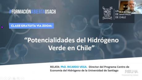 En contexto del programa de Formación Abierta del Departamento de Educación Continua de la Universidad de Santiago, se dictó la charla magistral online sobre “Potencialidades del Hidrógeno Verde en Chile”, el pasado 29 de octubre a las 17:00 hrs.