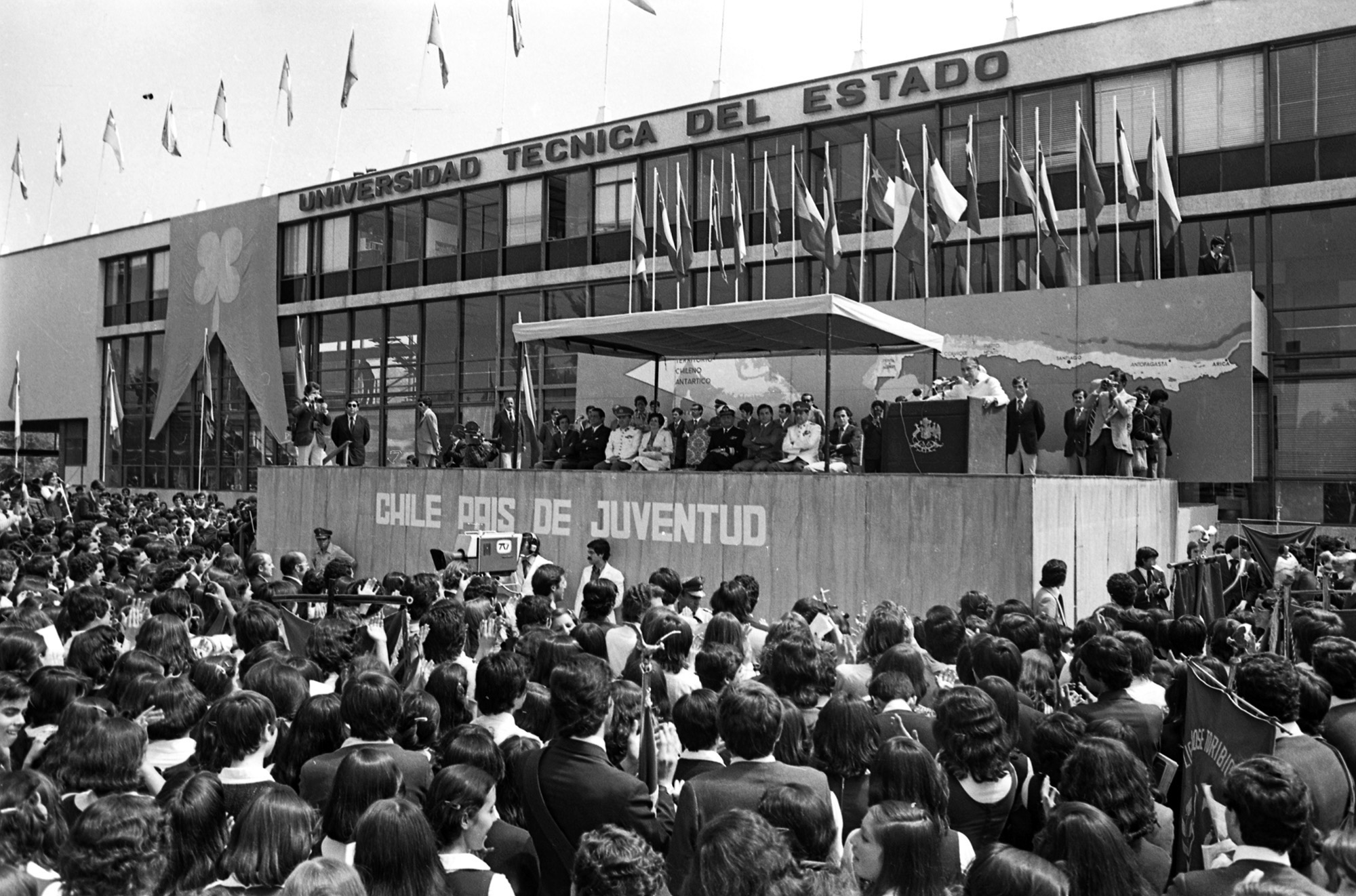 Explanada Casa Central UTE. Santiago, fecha estimada octubre de 1976. Discurso pronunciado en el marco del 2° aniversario de la Secretaría Nacional de la Juventud.