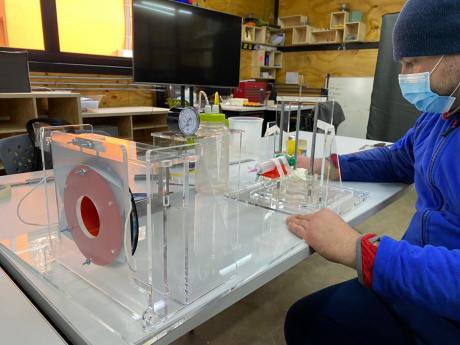 José Arias, Encargado del Laboratorio, destacó los desarrollos efectuados por este espacio creativo. “Las labores realizadas para este dispositivo se concentraron en trabajos de cortes de partes y piezas en acrílico, que fueron desarrolladas por nuestra cortadora láser Router RC-1390L. La impresión 3d se realizó a través de la impresora PRUSA, donde se ocupó PLA como material para luego dar paso al proceso de armado final del prototipo. La confección total para un modelo de esta envergadura fue de cinco días hábiles, mas menos, incluyendo el pegado de los acrílicos con cloroformo”.