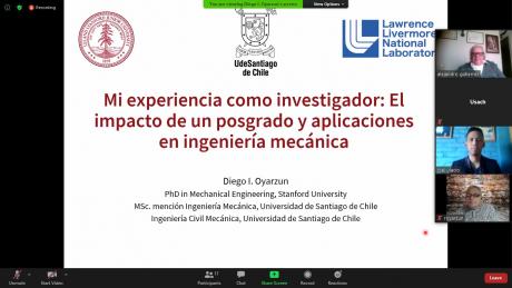 En el marco del “Ciclo de charlas de Egresados 2020” que impulsa el Departamento de Ingeniería Mecánica, el egresado Diego Oyarzún presentó: “Mi experiencia como investigador: El impacto de un posgrado y aplicaciones en ingeniería mecánica», instancia en la que abordó el proceso académico que atravesó para posicionarse en esta área en la ciudad de California, Estados Unidos.