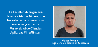 Matías Molina Elgueta, estudiante de Ingeniería de Ejecución en Mecánica, es el primer nominado para realizar el doble grado en la Universidad de Ciencias Aplicadas FH Münster. Este programa es parte del proyecto “International Engineering”, cuyo objetivo es generar estudios interdisciplinarios de Doble Grado en diversas disciplinas como ingeniería mecánica, eléctrica, ambiental, en energía y ciencias de la computación. En la iniciativa también participa la Universidad Pontificia Bolivariana de Colombia.