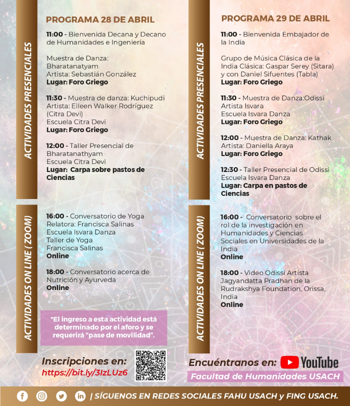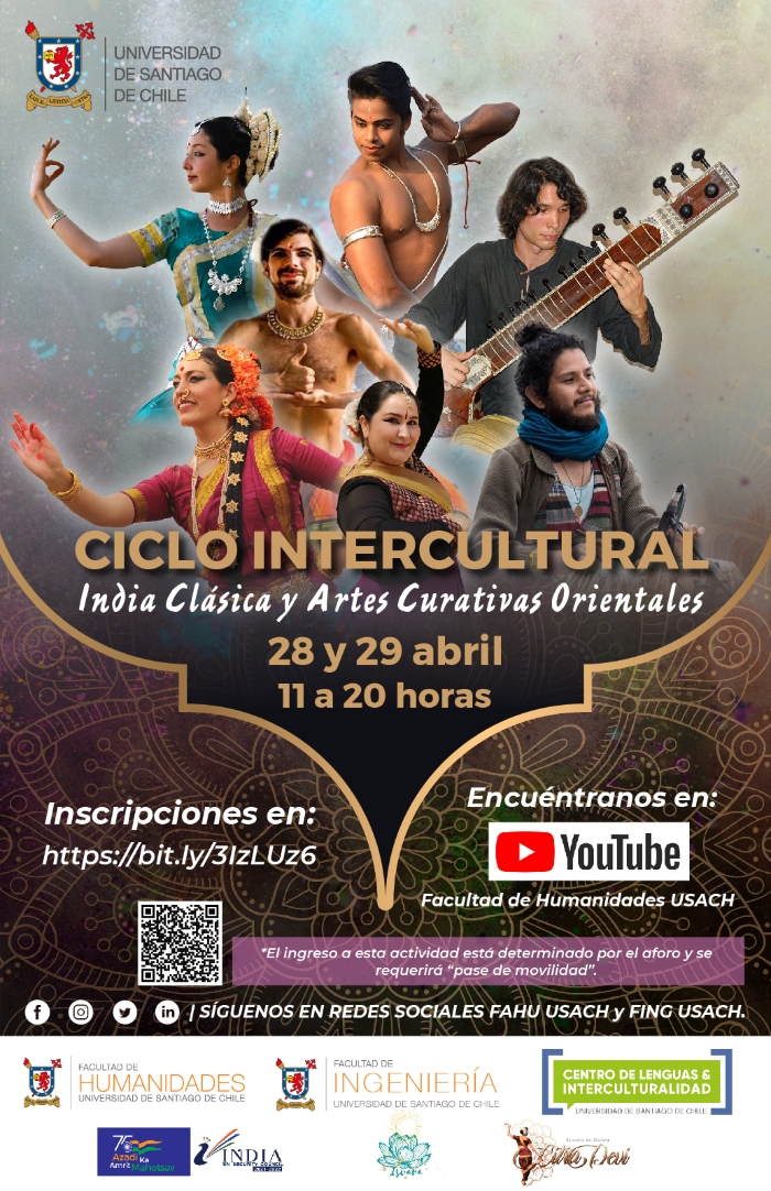 Continuando con el propósito de fomentar actividades de desarrollo integral, la Facultad de Humanidades, Facultad de Ingeniería, el Centro de Lenguas e Interculturalidad y el Departamento de Lingüística y Literatura de la Universidad de Santiago, llevarán a cabo el Ciclo Intercultural “India Clásica y Artes Curativas Orientales. La iniciativa busca aumentar el capital cultural de las y los estudiantes USACH y fomentar la interculturalidad.