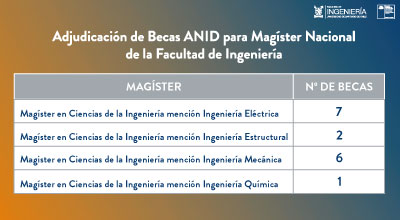 La Facultad de Ingeniería se adjudicó un total de 16 becas ANID para Magister Nacional, una cifra histórica, ya que el promedio de los últimos 5 años (2017 – 2021) había sido de 1.2 becas por año en toda la Facultad. Esto representa un aumento del 1333% con respecto a los años anteriores.