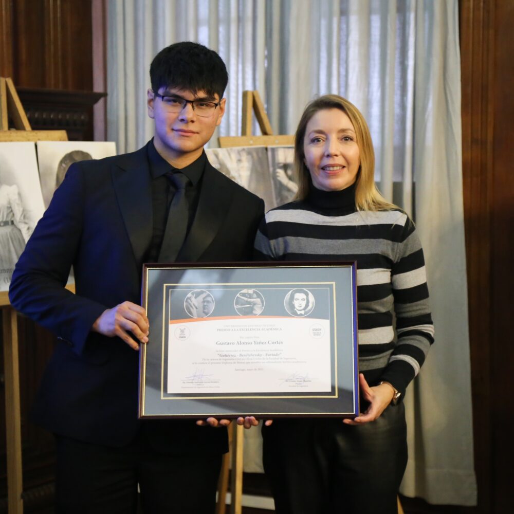 Gustavo Yáñez Cortés, estudiante de Ingeniería Civil en Obras Civiles, recibió el Premio a la Excelencia Académica que, en su trigésima versión, reconoció el legado de tres mujeres pioneras en el mundo de las matemáticas y la informática: Adelina Gutiérrez, Cecilia Berdichevsky y Elza Furtado.