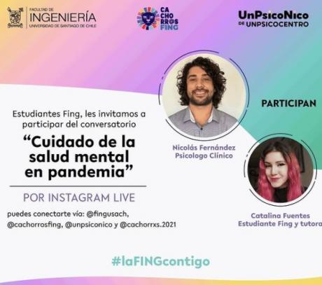A través de Instagram live y con alta convocatoria, se llevó a cabo el primer en vivo de la Facultad de Ingeniería en el que participó el psicólogo Nicolás Fernández (@unpsiconico), la estudiante de Ingeniería Civil Mecánica Catalina Fuentes, el Dr. René Garrido Lazo, Director de Vinculación con el Medio y María Eugenia Pino, profesional de la Facultad.