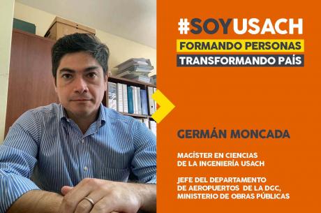 Convertirse en actor era el sueño que tenía Germán Moncada al concluir su enseñanza media. Sin embargo, su padre de profesión contador, fue quien lo impulsó a abandonar esa idea y optar por una carrera tradicional. Tal vez es uno de los ejemplos de tantos que existen en nuestro país que ven en las tablas su futuro, pero prima el tema económico por sobre el arte. Y no está arrepentido, porque fue en la propia Universidad de Santiago, que pudo también dedicar parte de su tiempo a electivos que llenaron en cierta medida esa vocación. Entró a estudiar Ingeniería Civil Industrial a la Facultad de Ingeniería y en el Campus conoció a quien es su esposa; fue profesor asistente de nuestra Casa de Estudios y hoy ocupa un alto cargo en el Ministerio de Obras Públicas.