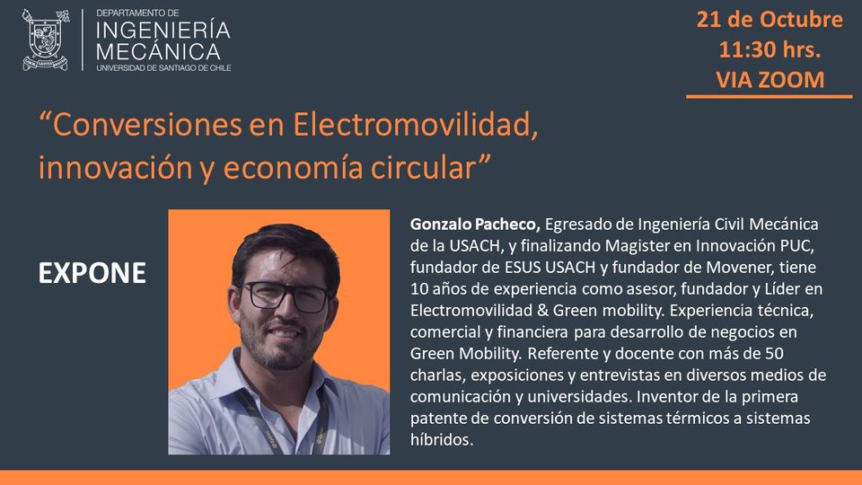 El “Ciclo de Charlas de Egresados” del Departamento de Ingeniería Mecánica, tuvo como expositor al egresado y fundador de ESUS USACH y Movener, Gonzalo Pacheco, quien además, cursa actualmente un Magíster en Innovación en la Pontificia Universidad Católica de Chile. Estos encuentros son organizados por el DIMEC, junto a la Asociación Gremial de Egresados del Departamento, AGEDIMEC.