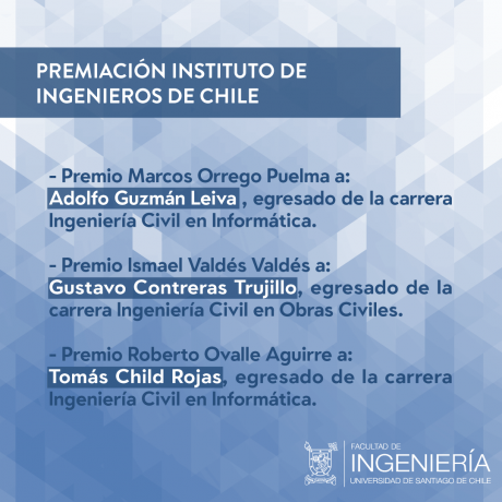 La ceremonia se realizó de manera virtual el pasado viernes 9 de octubre a partir de las 11:00 hrs y contó con la participación del presidente del Instituto de Ingenieros de Chile, Sr. Ricardo Nicolau del Roure y el secretario de dicha institución, Sr. Carlos Gauthier, junto a los decanos de las distintas Facultades participantes junto a sus representantes, los galardonados y sus familiares.