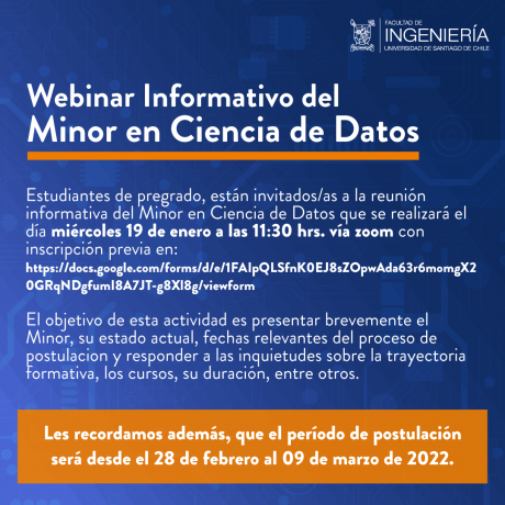 De esta concepción nace el Minor en Ciencia de Datos, que es un conjunto coherente de asignaturas que tendrá el propósito de entregar a las y los estudiantes de la universidad, herramientas de Inteligencia Computacional para potenciar su desempeño profesional. El Minor tuvo un año 2021 exitoso, con postulaciones de estudiantes desde todas las facultades de la universidad, lo que hacía necesario avanzar hacia la articulación formal. Al respecto, la Facultad de Ingeniería informa que está lista la primera ‘Resolución de Articulación’, documento que formaliza la inserción del Minor dentro de un programa de estudio, en este caso, de la carrera de Bioquímica de la Facultad de Química y Biología. Esto supone un significativo avance para la propuesta hecha desde la Facultad de Ingeniería a través de este Minor en Ciencia en Datos, y lo positivo es que están en camino muchas otras resoluciones que pronto anunciarán su formalización.