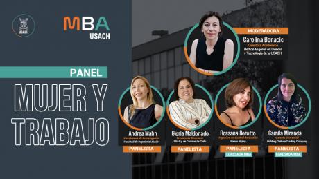 El Panel Mujer y Trabajo realizado por el MBA USACH y su Red de Graduados/as estuvo a cargo de las panelistas: Gloria Maldonado, Presidenta del Directorio de ENAP y del Directorio de Correos de Chile; Camila Miranda, Egresada MBA USACH y Gerente Comercial en Holding Chilean Trading Company S.A.; Rossana Borotto, Egresada MBA USACH e Ingeniero en Control de Gestión en Banco Ripley; y Dra. Andrea Mahn, Vicedecana de Investigación y Posgrado de la Facultad de Ingeniería de la Universidad de Santiago de Chile. También participó Carolina Binacic, Directora Académica de la Red Mujeres en Ciencia y Tecnología de la USACH, quien realizó el rol de moderadora.