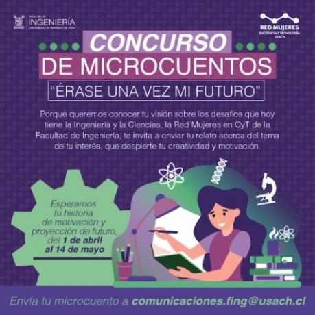 «Érase una vez en mi futuro» se titula el concurso de microcuentos en que la Red de Mujeres invita a la comunidad de estudiantes de pre y postgrado de la Facultad de Ingeniería, Facultad de Ciencias y Facultad Tecnológica, a relatar creativamente cuál fue su motivación para integrarse a la especialidad que eligieron y cuáles son sus proyecciones profesionales al egresar.