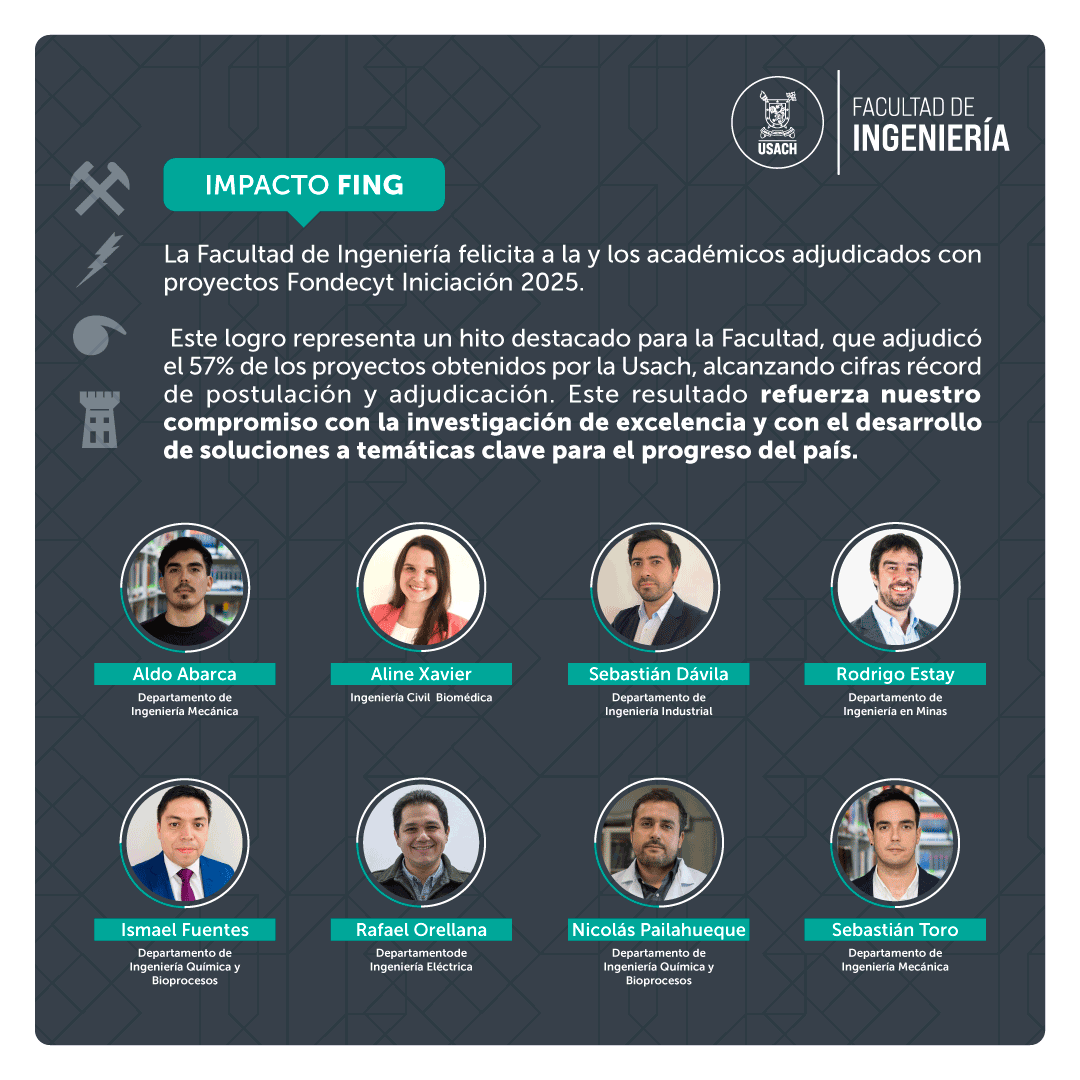 Con un 57% del total de adjudicados de la Usach, la Facultad de Ingeniería comunica la exitosa adjudicación para el concurso Fondecyt Iniciación 2025, de 8 de sus académicos.