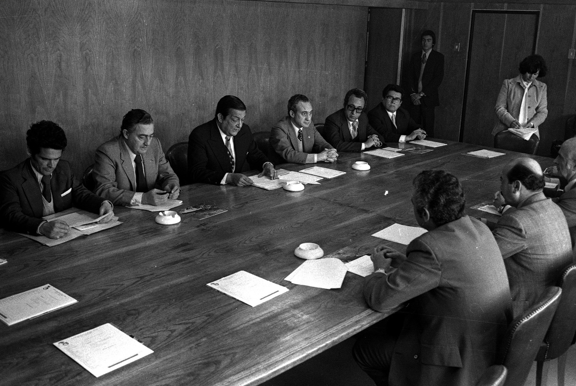 Universidad Técnica del Estado. Santiago, fecha estimada 1976. Se aprecia en la fotografía al Decano de la Facultad de Ingeniería, Arturo Meléndez y al Rector Designado Eugenio Reyes