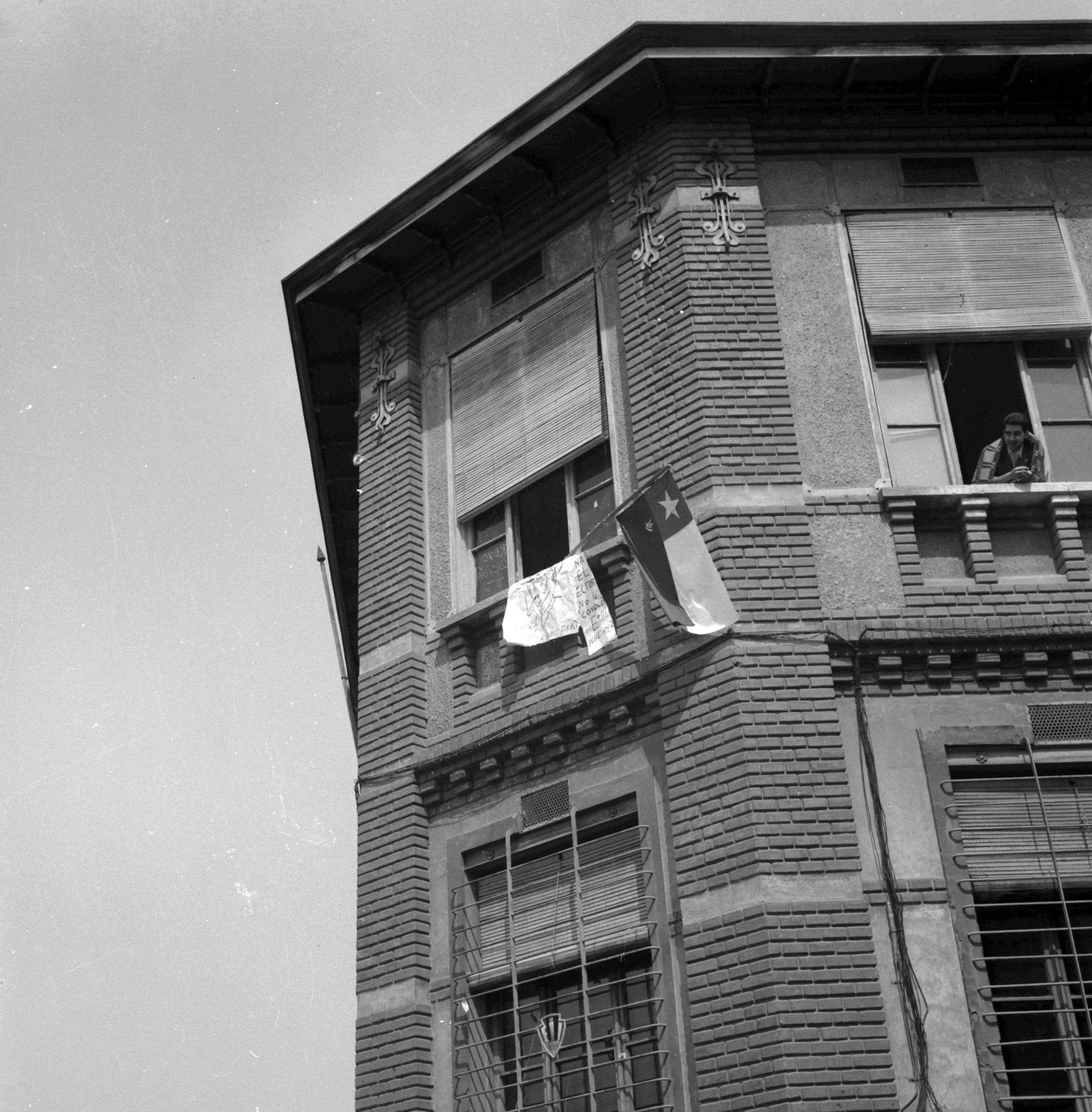 Santiago, sin fecha. La sede ubicada en la esquina de las calles Almirante Barroso y Santo Domingo, albergó a la Escuela de Ingenieros Industriales entre 1948 y 1962, cuando se trasladó definitivamente a las dependencias de la Unidad Universitaria. Para la época de la fotografía, década de los 60, el proceso de reforma universitaria se había gatillado con la Toma generalizada del 25 de mayo de 1961, en la fotografía se aprecia un lienzo y un dibujo alusivo a la falta de vinculación del rector de la época, Horacio Aravena, con las problemáticas de los estudiantes.